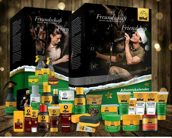 What is behind the 24 doors? Effol Advent Calendar Featuring 10 new products for humans and horses! The 2024 Advent Calendar includes: Effol Lip Butter HEY SPORT Tex Wash 75 ml Effol Friend-Snacks MiniBag 115 g effax Leather Balm 150 ml effax boot cleaner + shine 50 ml effax Boot Polish black Effol Never Tearer colour effax Leather Instant Shine 20er Display HEY SPORT Lambskin Wash 75 ml effax Leather Cream Soap Mini 30 ml Effol SuperStyling Spray 50ml Effol med BronchoCare-Dragees 1x 44 g Effol Mouth Butter 30ml Effol med BronchoCare Ointment 50 ml Effol Friend-Snacks MiniBag 115 g Effol Hoof Oil Gel 50 ml Effol Rider*Inside Hand Cream 75 ml Effol Hair Root Liquid 50 ml Mini Effol Skin Repair 30 ml HEY SPORT Micro Wash 75 ml Effol Skin Lotion 50 ml Effol Hoof Soft Cream 50 ml effax Leather-Combi 50 ml Mini Effol SuperStar-Shine Special Edition 250 ml