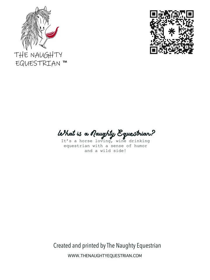- Greeting cards measure at 5” x 7” with a design on the front and our Naughty Equestrian logo on the back.