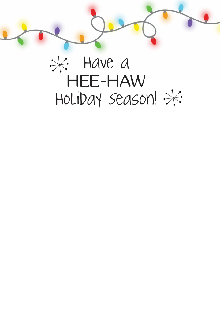 Inside: Have a Hee Haw Holiday Season! All of our cards are sleeved in plastic. Keeps them clean and crisp and keeps the envelope WITH the card. Artwork & Design: © June Evers, Horse Hollow Press Nothing makes us happier than a happy customer