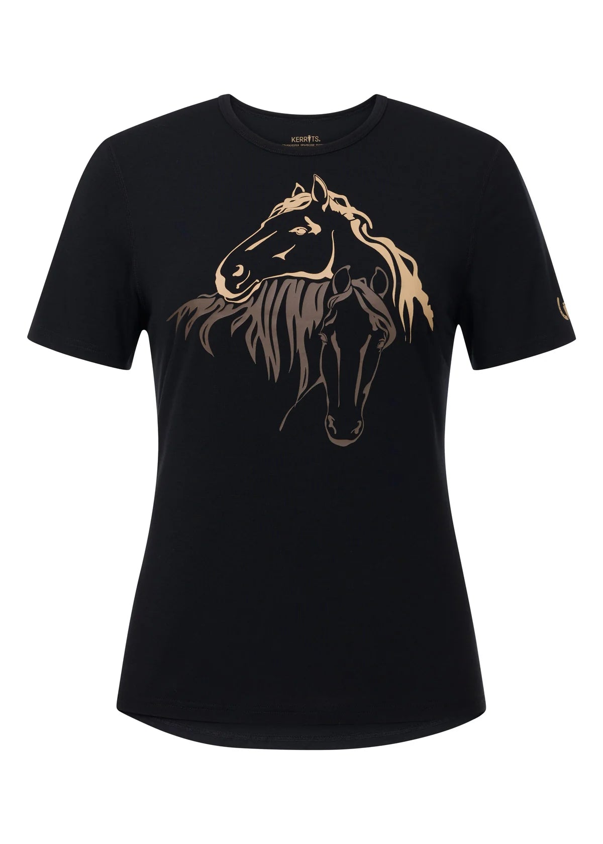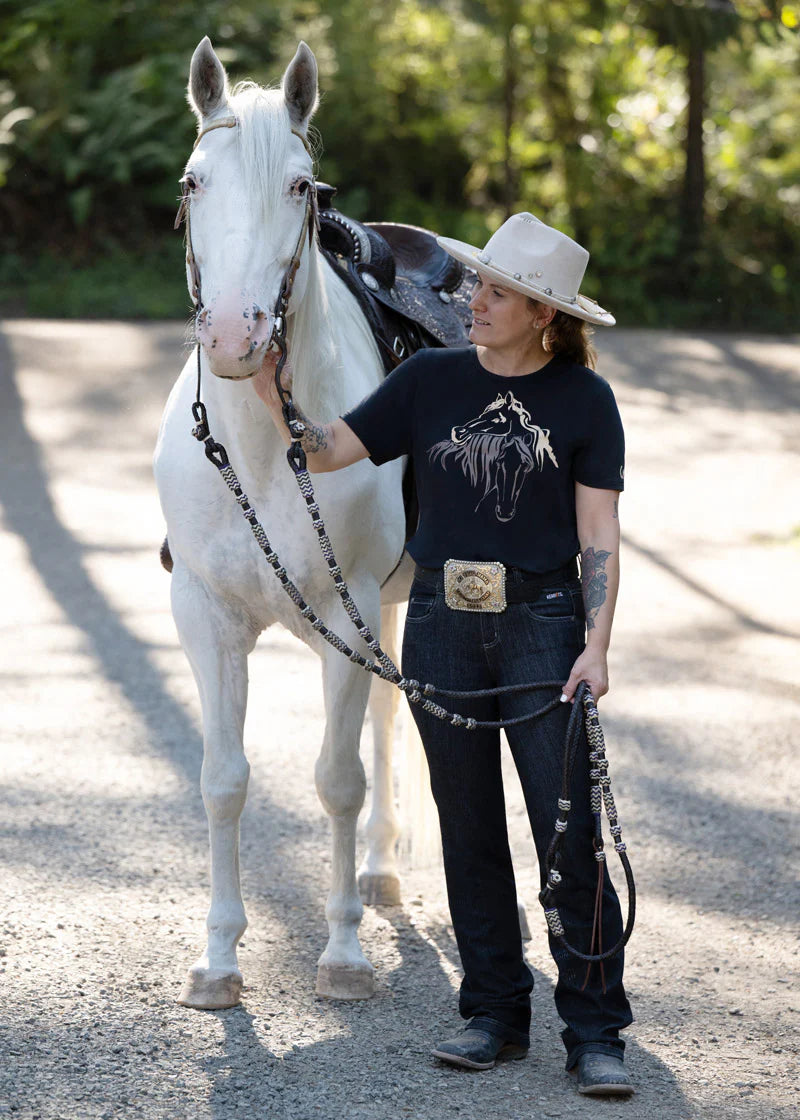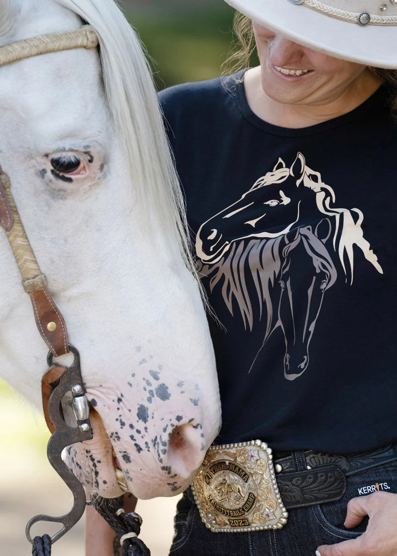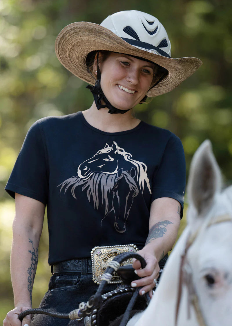 Two equine best friends share a quiet “embrace” on this soft, technical short sleeve tee that keeps you cool and comfortable all day long. Breathable and moisture-wicking, it’s built to handle warm-weather rides and everyday adventures with ease. The stretchy, feminine fit and hip-length cut offer just the right amount of coverage for a confident, carefree feel, whether you’re in the saddle or on the go.