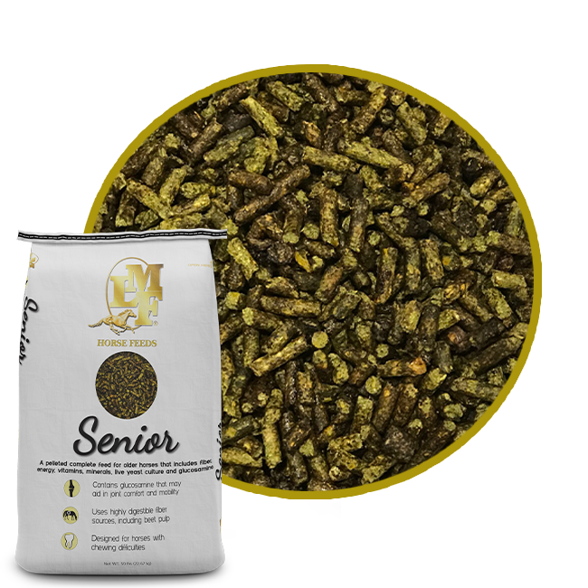 LMF Senior is a unique pelleted complete feed for older horses. The formula includes glucosamine for joint health along with fiber, energy, vitamins, minerals and live yeast culture to aid in digestion. Critical nutrients are presented in a highly palatable form that horses readily consume.