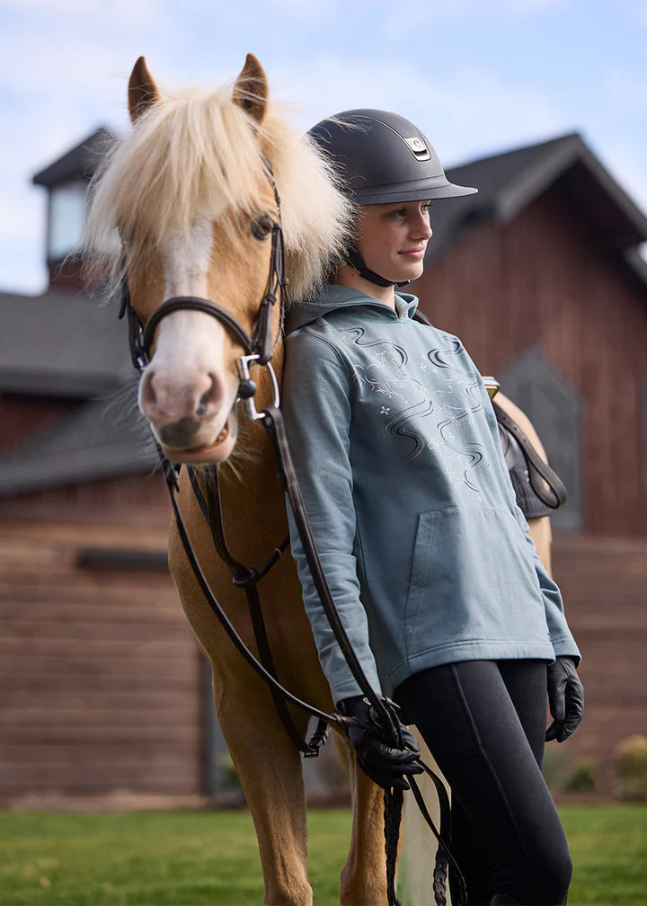 This cozy hooded pullover sweatshirt brings equestrian fun to young riders’ everyday style. Made from durable mid-weight fabric, it features a warm fleece interior and soft matte exterior for comfort. The exclusive Kerrits “Ride the Wind” graphic on the front adds a playful touch, while the hood provides extra warmth after taking off a helmet. A handy kangaroo pocket keeps hands warm and holds pony treats, making it perfect for days at the barn or on the go.